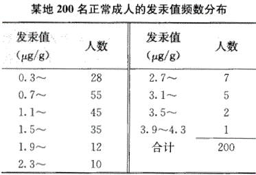 抽样调查得某地200名正常成人的发汞值,资料如下表所示: