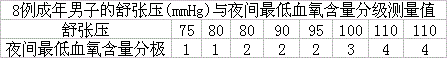 某研究者对8例30~50岁成年男子的舒张压(mmHg)与夜间最低血氧含量分级进行研究,结果见下表。欲分析舒张压与夜间最低血氧含量分级有无关系,宜采用