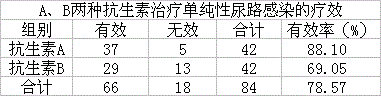 检验的校正公式B、四格表资料的确切概率法C、某研究欲比较D、B两种抗生素治疗单纯性尿路感染的疗效,将84例患者随机等分成两组,一组采用A药治疗,一组采用B药治疗,7天后观察疗效,资料如下表所示,宜采用E、
