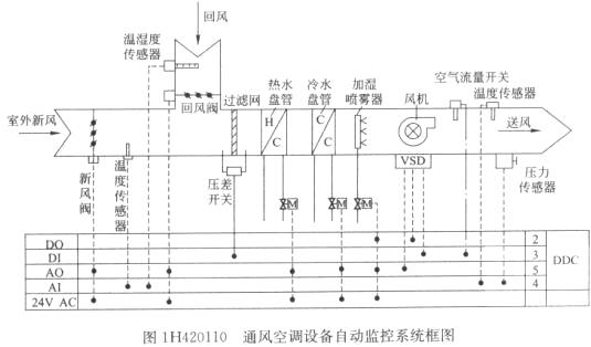 安装公司根据设计院提供的通风空调设备自动监控系统框图(见下图),对通风空调设备系统进行了调试检测。