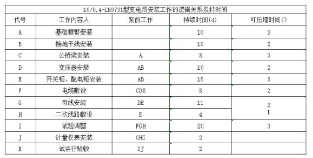 1、按表计算变电所安装计划工期,如果每项工作都按表压缩天数,变电所安装最多可以压编到多少天