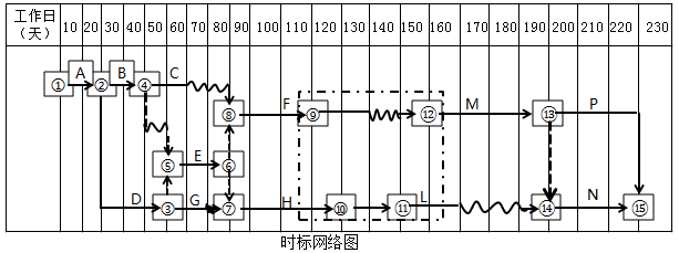 1.按最早开始时间补充绘制时标网络图中虚框内的图形(将虚框内的内容复制在答题卡上作答),并写出关键线路和工期。