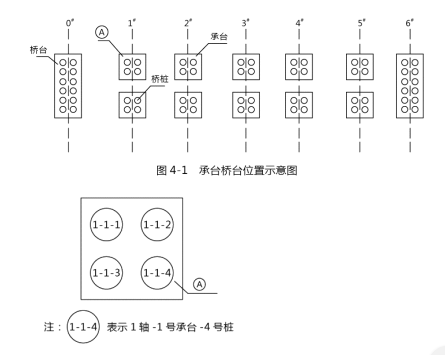 某公司项目部施工的桥梁基础工程,灌注桩混凝土强度为 C25 直径 1200mm,桩长 18m承台、桥台的位置如图所示 4-1 所示,承台的桩位编号如图 4-2 所示。