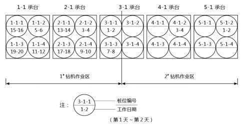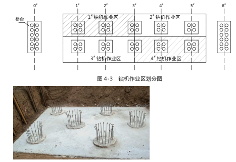 事件一:项目部依据工程地质条件,安排 4 台反循环钻机同时作业,钻机工作效率(1根桩/2d)。在前 12 天,完成了桥台的 24 根桩,后 20 天要完成 10 个承台的 40 根桩。承台施工前项目部对 4 台钻机作业划分了区域,见图 4-3。并提出要求:1. 每台钻机完成 10 根桩 2. 一座承台只能安排 1 台钻机作业,3. 同一承台两桩施工间隙为 2 天。