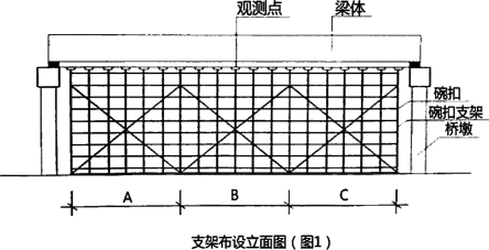 某跨度40m现浇预应力钢筋混凝土简支梁桥,采用后张法张拉预应力。施工单位采用碗扣式满堂支架施工(见图1),支架由钢管、扣件、型钢等组成,纵横梁采用电弧焊连接。支架为就近租赁,为保证支架安装质量,施工单位认真检查了扣件的外观质量。为了保证支架的承载力以及消除支架和支架地基引起的塑性变形,对支架进行了堆沙袋预压,压重为梁自重的1.2倍(梁自重加施工荷载),并在跨中支架顶部设置了标高观测点。 观测点预压前标高为185.756m,进行分级预压,100%预压荷载时观测点的标高为185.701m。预压稳定后进行了分级卸载,卸载后观测点的标高为185.725m。 经计算,该桥达到了设置预拱度的条件,恒载、活载、混凝土温度、徐变、收缩引起挠度见表1,并按二次抛物线设置预拱度。跨中底板的设计标高为185.956m。梁体浇筑后进行了预应力的张拉,然后拆除支架。为保证施工安全,拟定分三部分(A、B、C)见图1),分批次分次拆除支架。 恒载、活载、混凝土温度、徐变、收缩引起挠度表(表1)