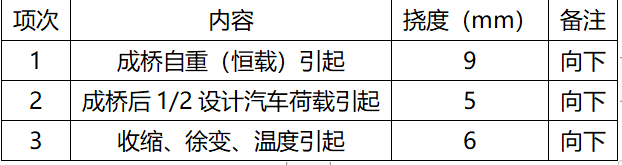 恒载、活载、混凝土温度、徐变、收缩引起挠度表(表1)