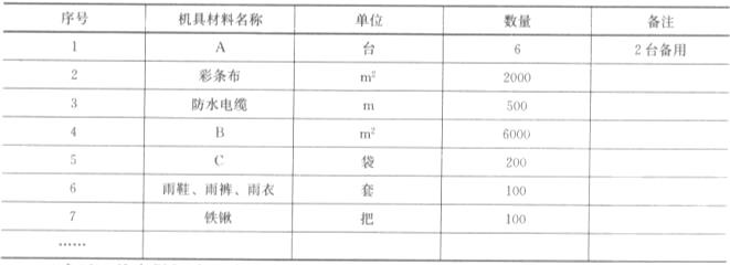 某施工单位承包了高速公路M合同段路基工程,合同工期2年,每年5~8月为雨期。本合同段有填有挖,且需以挖做填,项目部充分考虑雨期对施工的影响,对选择施工的项目进行详细考察,编制雨期施工专项方案,项目物资部门针对雨期施工方案,在雨期施工前将工程所需防雨、防洪物资组织进场,主要有: