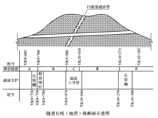 1.背景材料:某高速公路隧道为双线分离式隧道,左线起讫桩号为ZK9 + 680~ZK10 + 303,全长623m,右线起讫桩号为YK9 + 683~YK10 + 305,全长622m。隧道净空宽度为10m,净空高度为6.49m,该隧道右线(地质)纵断面图如下图所示。图中水文、地质概况如下图所示: