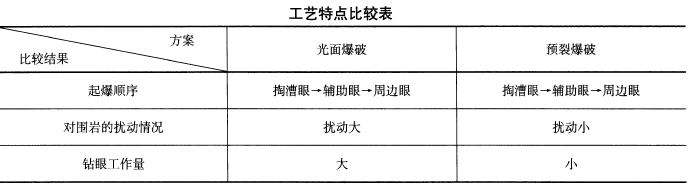 根据围岩分级的综合评判方法,该右线隧道围岩分布有Ⅲ、Ⅳ、Ⅴ级围岩。为确定YK9 + 730~YK9 + 790(B 段中前部分)施工方法,承包人对预裂爆破和光面爆破的工艺特点进行了比较(见下表),结合本段的地质特点,决定采用预裂爆破方案施工。