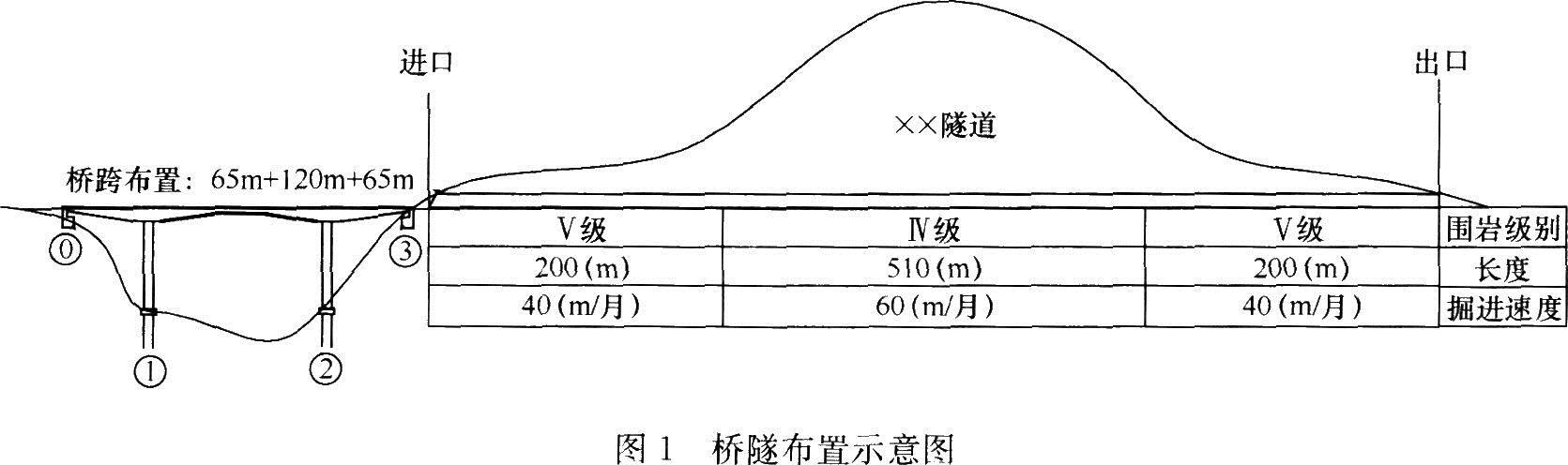 某施工单位承接了二级公路一桥隧相连项目,其中桥梁桥跨布置为(65+120+65)m,③号桥台紧邻隧道进口洞门。隧道全长910m,净宽12m,净高5m,单洞双向两车道,最大埋深100m,进、出口50m范围内埋深均小于20m(属浅埋隧道)。桥跨布置与隧道围岩级别及其长度、掘进速度如图1所示。