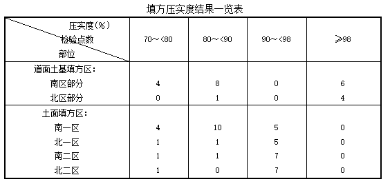 技术标准:道面土基填方区,压实度不小于98%;土面填方区,压实度不小于90%,施工过程中对道面土基、土面区压实度进行了检验,检验结果见下表: