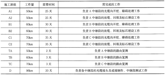 项目部将三个中继段均分为两个作业组进行流水作业;每个中继段的作业组中,1组负责挖沟及障碍处理,2组负责放缆、回填及标石的埋设,各组的日进度均为2km;三个中继段的路由复测工作分别由TA、TB、TC三个作业组完成。光缆盘长为标准盘长2km。由于施工单位只能为项目部配备一套测试仪表及一台熔接设备,因此项目部安排三个中继段的接续测试工作均由D组负责完成。各中继段的竣工资料整理工作包含在施工过程中完成,不再单独安排时间编制。各组的工作量、完成时间以及需完成的工作见下表。
