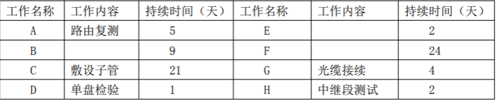某大型施工单位承接了某运营商的一项管道光缆线路工程,工作内容和持续时间见表 5。![]()