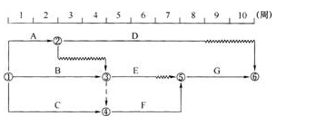 某工程时标网络图如下图所示。计划执行到第5周末检查实际进度。发现D工作尚需3周完成,E工作尚需1周完成,F工作刚刚开始。由此可以判断出( )。![]()
