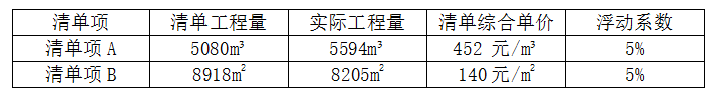 在总承包施工合同中约定“当工程量偏差超出 5%时,该项增加部分或剩余部分综合单价按 5%进行浮动”。施工单位编制竣工结算时发现工程量清单中两个清单中两个清单项的工程数量增减幅度超出 5%,其相应工程数量、单价等数据详见下表: