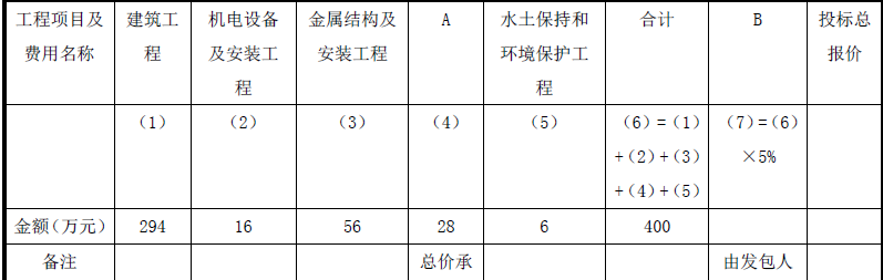 某渠首闸是一座中型水闸,闸孔共3 孔,单孔宽4.5m,项目划分为一个单位工程,一个标段,某投标人投标文件有如下内容: (1)已标价工程量清单(分组工程量清单模式)中投标报价汇总表如下: 投标报价汇总表(分组工程量清单模式)![]()