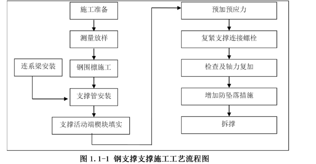 C 段明挖隧道施工的围护结构采用钻孔灌注桩,内部采用3 道φ609 钢管支撑,钢支撑安装的施工艺流程为: