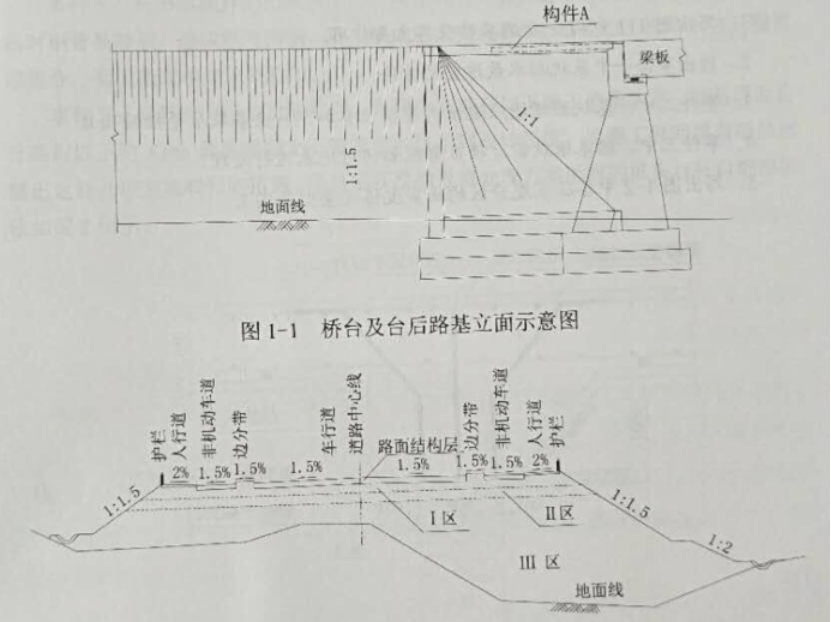 (2019年)某公司承建一项路桥结合城镇主干路工程。桥台设计为重力式U型结构,基础采用扩大基础,持力层位于砂质黏土层,地层中有少量潜水;台后路基平均填土高度大于5m。场地地质自上而下分别为腐殖土层、粉质黏土层、砂质黏土层、砂卵石层等。桥台及台后路基立面如图1-1所示,路基典型横断面及路基压实度分区如图1-2所示。