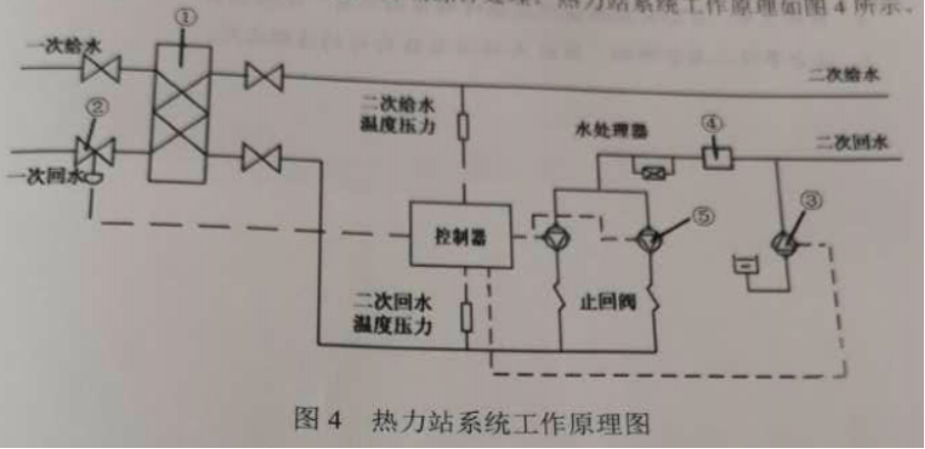 (2019年)A公司中标承建一项热力站安装工程,该热力站位于某公共建筑物的地下一层。一次给回水设计温度为125℃/65℃,二次给回水设计温度为80℃/60℃,设计压力为1.6MPa;热力站主要设备包括板式换热器、过滤器、循环水泵、补水泵、水处理器、控制器、温控阀等;采取整体隔声降噪综合处理,热力站系统工作原理如图4所示。?