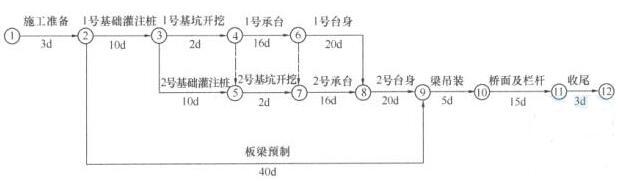 某市政跨河桥上部结构为长13m单跨简支预制板梁,下部结构由灌注桩基础、承台和台身构成。施工单位按合同工期编制了如下网络计划图,经监理工程师批准后实施。