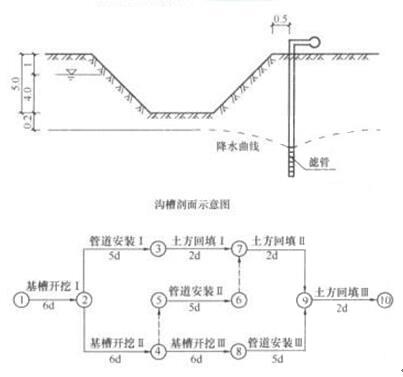 某施工单位承接了一项市政排水管道工程,基槽采用明挖法放坡开挖施工。基槽宽度为6.5m,开挖深度5m。场地内地下水位于地表下1m,施工单位拟采用轻型井点降水,井点的布置方式和降深等示意图如下:施工单位组织基槽开挖、管道安装和土方回填三个施工队流水作业,共划分Ⅰ、Ⅱ、Ⅲ三个施工段。根据合同工期要求绘制网络进度图如下:
