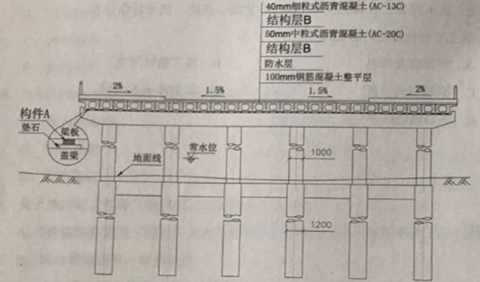 <1>、写出图1中构件A和桥面铺装结构层B的名称,并说明构件A在桥梁结构中的作用。