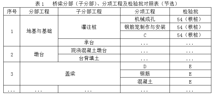 开工前,项目部对该桥划分了相应的分部、分项工程和检验批,作为施工质量检查、验收的基础。划分后的分部(子分部)、分项工程及检验批对照表如表1。