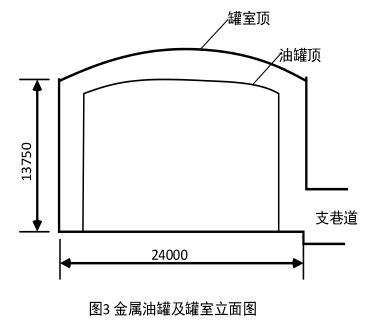油罐布置在一条主巷道两侧的罐室中,罐室尺寸见图3所示,由支巷道进入罐室,支巷道剖面尺寸为3.6m×3.9m(宽×高),安装操作空间相当狭小,另支巷道毛地面不平坦,运输和吊装困难,且罐室内无通风竖井,必须通过支巷道通风换气。