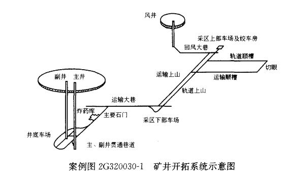某矿井开拓系统如案例图2G320030-1所示。一施工单位承担了该矿井的施工任务, 施工方案采用对头掘进。主井先开工,计划主、副井同时到底后短路贯通,然后主井临时 改绞、副井永久装备,副井交付使用后主井进行永久装备。井下施工不间断向采区方向推 进。风井方向施工在到底后也进行改绞,然后掘进采区巷道。主副井与风井贯通后,立即 开展采区顺槽和切眼的施工,同时平行进行采区设备的安装和试运转。