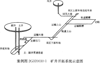 某矿井开拓系统如案例图2G320030-1所示。一施工单位承担了该矿井的施工任务,施工方案采用对头掘进。主井先开工,计划主、副井同时到底后短路贯通,然后主井临时改绞、副井永久装备,副井交付使用后主井进行永久装备。井下施工不间断向采区方向推进。风井方向施工在到底后也进行改绞,然后掘进采区巷道。主副井与风井贯通后,立即开展采区顺槽和切眼的施工,同时平行进行采区设备的安装和试运转。