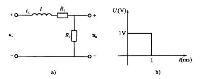 图a)所示电路中,R1=500Ω,R2=500Ω,L=1H,电路激励U1如图b)所示,如果用三要素法求解电压U0,t≥0,则: