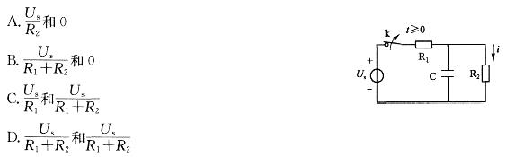 图示电路中,开关k在t=0时刻打开,此后,电流i的初始值和稳态值分别为:![]()