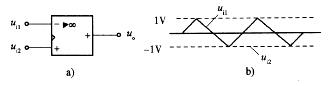 将运算放大器直接用于两信号的比较,如图a)所示,其中,ua=-1V,ua的波形由图b)给出,则输出电压u0等于: