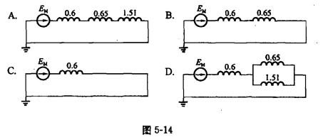 220kV线路(见图5-13)K点A相单相接地短路。电源、线路阻抗标么值已在图中注明,额定电压为220kV,基准容量为1000MVA。图5-14中K点A相接地短路时复合序网图正确的是()。