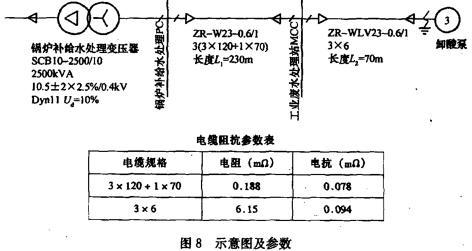 —台卸酸泵电动机功率为3kW,由锅炉补给水处理PC通过工业废水处理MCC供电,如图8所示。已知锅炉补给水处理变压器2500kV
