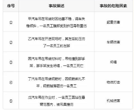 某建筑施工项目使用了汽车吊,为了充分识别吊装作业的危险因素,该项目安全管理人员对汽车的事故数据进行了记录。事故描述和危险因素分类,根据《企业职工伤亡事故分类》(GB6441) ,下列事故危险因素分类错误的是( )。