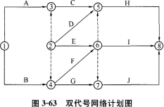 某分部工程中各项工作间逻辑关系见表3-9,相应的双代号网络计划如图3-63所示,图中错误有()。 各工作逻辑关系表表3-9![]()