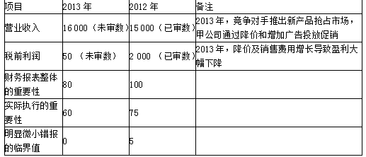 (1)2012年度财务报表整体的重要性以税前利润的5%计算。2013年,由于甲公司处于盈亏临界点,A注册会计师以过去三年税前利润的平均值作为基准确定财务报表整体的重要性。