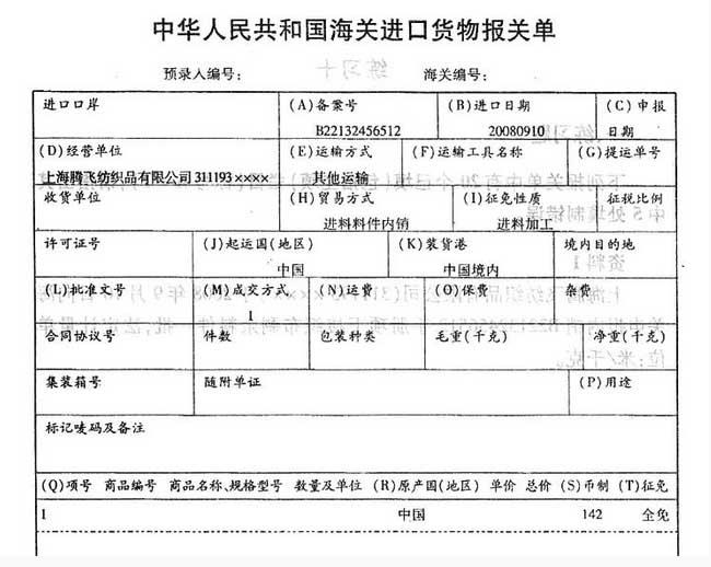 练习题(五) 上海腾飞纺织品有限公司(311193XXXX)于2008年9月10日向海关申报内销B22132456512手册项下梭织布剩余料件一批,法定计量单位:米/千克。