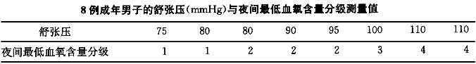某研究者对8例30~50岁成年男子的舒张压(mmHg)与夜间最低血氧含量分级进行研究,结果见下表。欲分析舒张压与夜间最低血氧含量分级有无关系,宜采用