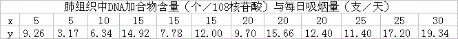 欲研究肺癌患者肺组织中的DNA加合物含量(个/10核苷酸)与吸烟的关系,某研究者用"同位素标记法"测定了12名肺癌患者肺组织中DNA加合物含量(y),并调查其每日吸烟量(z),结果见下表: