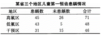 某省从3个水中氟含量不同的地区随机抽取10~12岁儿童,进行第一恒齿患龋率的调查,结果如下表:
