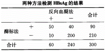 分别用反向血凝法和酶标法对300名献血员进行HBsAg检测,结果如下: