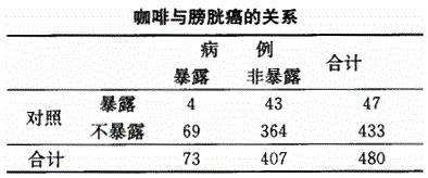 在一项1:1配对的病例对照研究中,将性别作为匹配因素,研究饮用咖啡与膀胱癌的关系,得到以下资料:OR值为