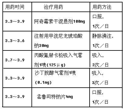 患儿,男,5岁,体重18kg,以"咳嗽、憋喘2天"之主诉入院,临床诊断为"急性支气管炎,支气管哮喘"。入院查体:T36.6℃,BP110/65mmHg,P100bpm,R26bpm,鼻通气良好,各鼻窦区无压痛。咽充血,双肺呼吸音粗,可闻及哮鸣音。血常规:白细胞计数10.97×10