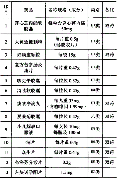 2015年5月,原国家食品药品监督管理总局发布《关于穿心莲内酯软胶囊等13种药品转换为非处方药的通知》,将穿心莲内酯软胶囊等13种药品(化学药品2种、中成药11种)转换为非处方药。具体的转换为非处方药的13种药品名单见下表。在上述表格中,穿心莲内酯软胶囊、妇康宝颗粒、痰咳净滴丸等药品的类别为"甲类",备注为"双跨",其中的"双跨"是指