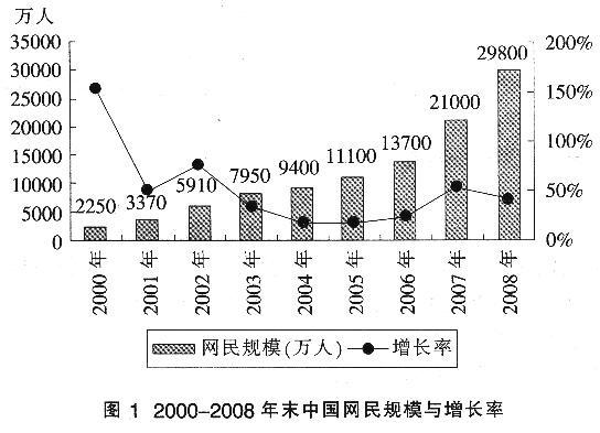 截至2008年12月31日,中国网民规模达到2.98亿人,普及率达到22.6%,宽带网民规模达到2.7亿人。手机上网网民规模达到11760万人,较2007年增长了133%。农村网民规模增长迅速,达到8460万人,较2007年增长60.8%,增速远远超过城镇。在我国东中西部地区中,西部省份网民增长最快,网民增速达到52.0%,远远超过中部(40.6%)和东部(39.3%)地区。