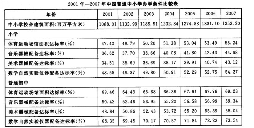 2007年与2001年相比,小学四项达标率增幅最小的是( )。