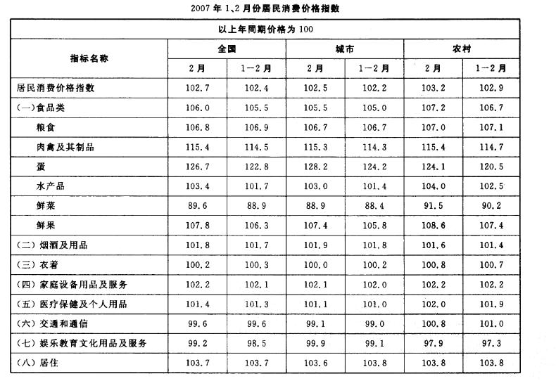 在表中八类指标名称中,2007年2月城市居民消费超过上年同期的有()大项。