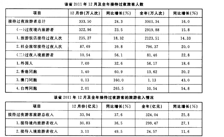 2011年某省接待过夜游客总量再次实现突破,达到3001. 34万人次,同比增长16. 0%。实现旅游收入324. 04亿元,同比增长25. 8%。12月份宾馆平均开房率为74. 02%,同比增长0. 06%;全年累计宾馆平均开房率为62. 37%,同比增长2.0%。